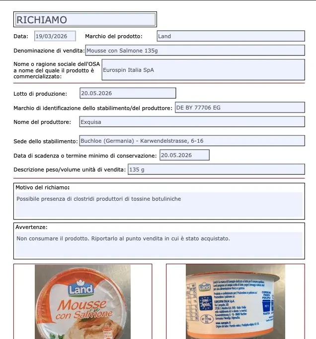 L’allarme è scattato ufficialmente ieri, 19 marzo 2026, ma la conferma definitiva è arrivata oggi, 20 marzo, con la pubblicazione dell’avviso sul portale del Ministero della Salute. La mousse in questione, commercializzata in confezioni da 135 grammi, è prodotta dall’azienda Exquisa nel sito produttivo di Buchloe, in Germania, per conto di Eurospin Italia SpA. Il lotto incriminato coincide con la data di scadenza del prodotto, fissata al 20 maggio 2026. Secondo quanto comunicato nell’informativa di richiamo, il provvedimento è stato adottato dal produttore in via precauzionale per la «possibile presenza di clostridi produttori di tossine botuliniche».